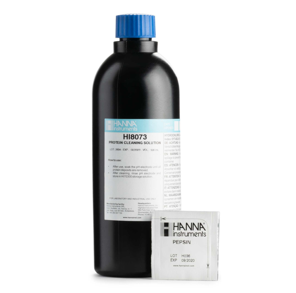 HI8073L是一种特殊的酶清洗解决方案,装在符合FDA标准的瓶子中。它是专门为允许电极与蛋白质接触的应用而配制的。电极在使用过程中可能会变脏,即使它们在pH缓冲液中正确读取,也会产生不准确的结果。Hanna 的清洁解决方案可消除测量过程中浸入样品时留在电极表面且储存不正确的杂质和残留物。Hanna 建议定期清洁电极的灯泡和液络部,以确保探头始终保持清洁,并fang止液络部堵塞。